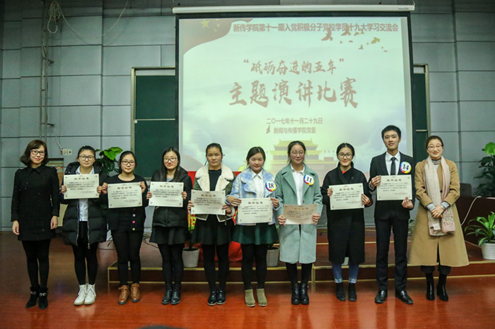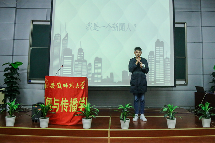 来自16级新闻学专业的曹寅飞同学跟大家分享了他选择新闻学这个专业的故事,以及在这个过程中从迷茫到探索到逐渐清晰的认知改变,他说:很多事光有记录是不够的,我要记录地深刻,让别人都了解这些,了解到有那么多不同的地方那么多与我们不一样的人,这是新闻人的职责。来自16级播音与主持艺术专业的赵欢同学说,她的播音梦想起源于2008年北京奥运会时欧阳夏丹那似乎可以团结力量、传达自信的声音,接触专业至今,她表示有信心牢记党和人民的使命,发出新时代之声。2015级新闻学的徐奥萍和2016级新闻学的张吴越则通过自己的实习和实践经历分享了五年里自己身边人的变化以及自己新闻理想的变化,表达了对党和国家未来的充分信心。