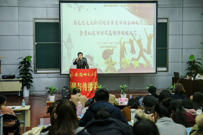 胡靖在受聘仪式上致辞,也为在场的全体师生上了一堂生动的微党课。作为一名部校共建公司的党委书记,作为一名马克思主义新闻观教育的一线理论教师,他对马观教育有着特殊的情怀:“看着一批批的员工对于马克思主义新闻观的态度从‘我不听’到‘我不懂’到‘我不拒’再到‘我不悔’的转变,这让我感受到了教育力量的不断展现,同学们成长脚步的不断延伸,这是我们老师最为欣慰的事情”。关于十九大精神的学习宣传与贯彻,他认为学深悟透是首要的,这也是检验我们党校培养质量和学员学习质量的首要标准,他用“一次大会与一个时代、一次大会与一代青年、一次党校与一种人生”三个标题带领大家学习十九大精神。他指出,一次党的大会往往都开创一个时代,十九大开启的新时代是一个社会发展从量变到质变的时代,是社会矛盾从低级到高级转换的时代,是发展理念从单一到科学转换的时代。这次大会对于一代青年而言,同时也就是人生底色,生逢其时的当代老员工是国家和社会的建设者、主力军,党关心爱护青年,青年也要争做时代弄潮儿。最后,他强调,走进新时代的党校被赋予了许多使命,马克思主义新闻观是一种科学的新闻观,也是新闻传播学子的定星盘,全体党校学员都要在马克思主义新闻观的学习中做到真学、真懂、真信、真用、真传、真做,每位学子都要用优异的成绩走出党校,更要用一生去践行马克思主义新闻观!