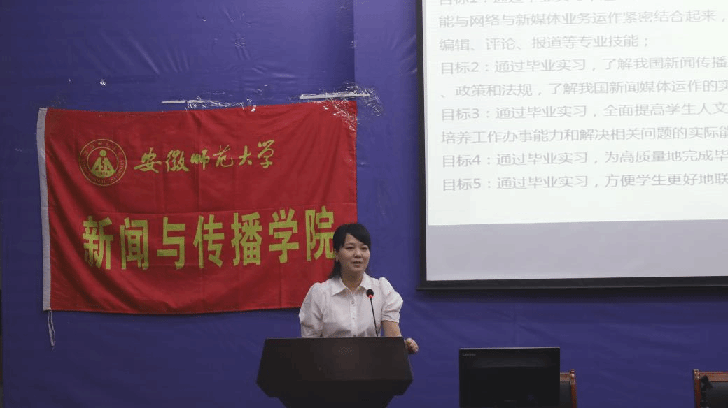 紧接着,林燕对即将启动的实习工作进行了全面且详细的说明。她明确专业实习将采取自主实习和集中相结合的的方式,并指出专业实习是一门必修课程,是培养合格网络与新媒体专业毕业生的重要实践环节。林燕细化了实习的五大目标,详细说明了专业实习的内容、具体要求和步骤,要求同学们严格遵守纪律,到达实习单位后及时联系导师,在导师的指导下进行业务和技能实习、完成一定数量的媒体作品。同时鼓励同学们抓住实习实训的机会,收集新闻传播理论与业务方面的典型案例、研究文章、优秀新闻作品,在实践中提高网络与新媒体采访、摄影、摄像、写作、编辑、评论、报道等专业技能,进一步了解我国新闻传播工作者的职责、任务和权利,了解新闻传播工作的方针、政策和法规。