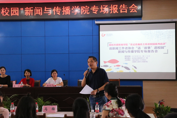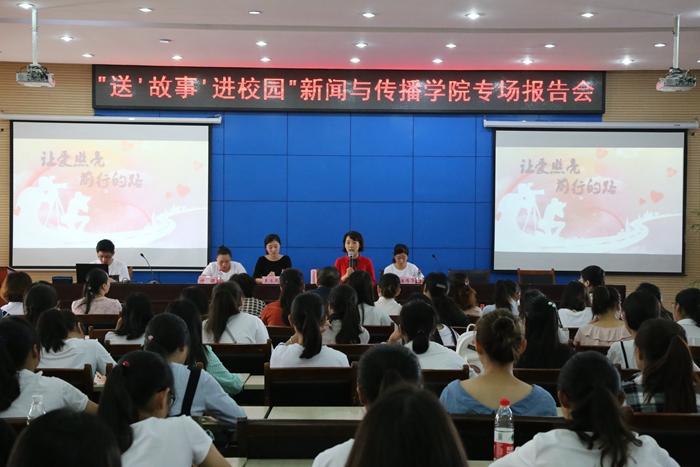 报告团成员、来自铜陵日报社的记者钟灏,分享了她的采访故事,钱胜利、徐继虎勇救坠楼儿童,独臂老王面对困境仍然坚强地生活,这些故事让在场聆听报告的师生认识到:新闻是有温度的故事,这种温度不是机器人新闻可以代替的。安徽新媒体集团的“网红主持人”王冰燕以《太阳花开好了》为题,讲述了白血病儿童的生活状态和困难,通过她的不懈努力和报道,更多的人开始关注和救助白血病儿童,世界成了美好的人间。淮南广播电视台记者徐沁,用残疾教师李元芳八年如一日“跪守”三尺讲台为员工讲课的感人事迹,诠释了《让爱照亮前行的路》。《脚下有泥,心中有爱》是淮北广播电视台记者潘伟华的报告题目,她脱下婚纱奔赴新闻现场、冒险报道淮北地区浍河污染问题,让人震撼,她用行动告诉了我们记者的含义。