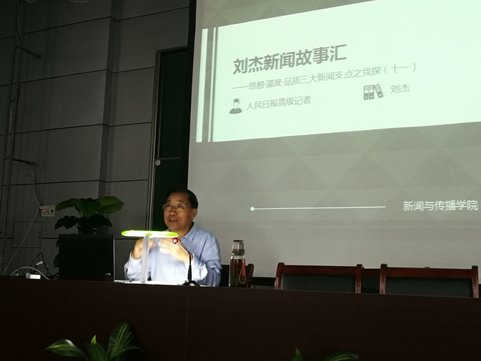 9月25日至27日,人民日报社安徽分社原社长、人民日报高级记者刘杰在1号教学楼307演播室举行了新学期“新闻故事汇”三场专题讲座,讲座由新闻学专业主任肖叶飞主持,研究生与新闻学专业本科生分别聆听了三场讲座。