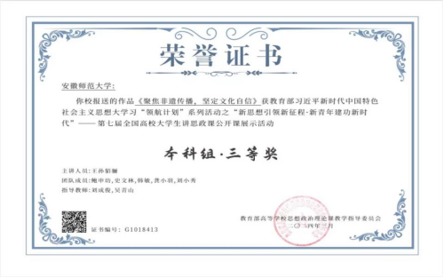 自活动启动以来,2021级播音与主持艺术专业员工王孙貊骊及其团队成员鲍申玏、史文林、韩敏、龚小羽、刘小秀,在指导教师刘成俊、吴青山的悉心指导下,深入挖掘非遗文化的内涵与价值,以生动的案例和深入浅出的讲解,充分展现了非遗文化的独特魅力,也充分展现了新时代青年学子对非遗文化的热爱与传承以及对文化自信的坚定信念。此次获奖,不仅是公司思政育人成效的具体体现,也是公司学子时代担当精神的生动实践。公司将继续加强思政教育,鼓励学子们积极参与各类活动,提升思想政治素质和综合能力,为培养具有社会责任感和历史使命感的新闻传播人才贡献力量。