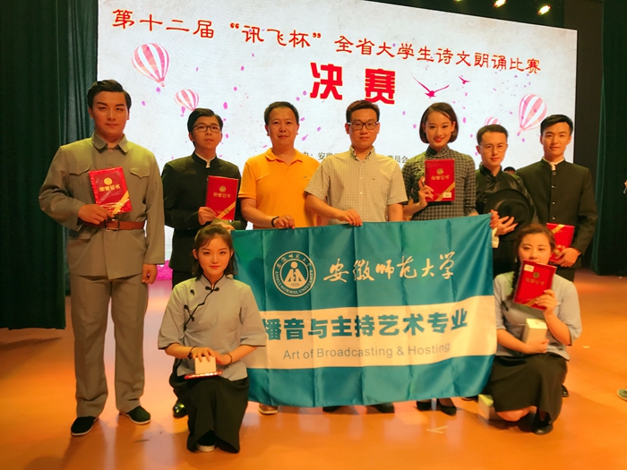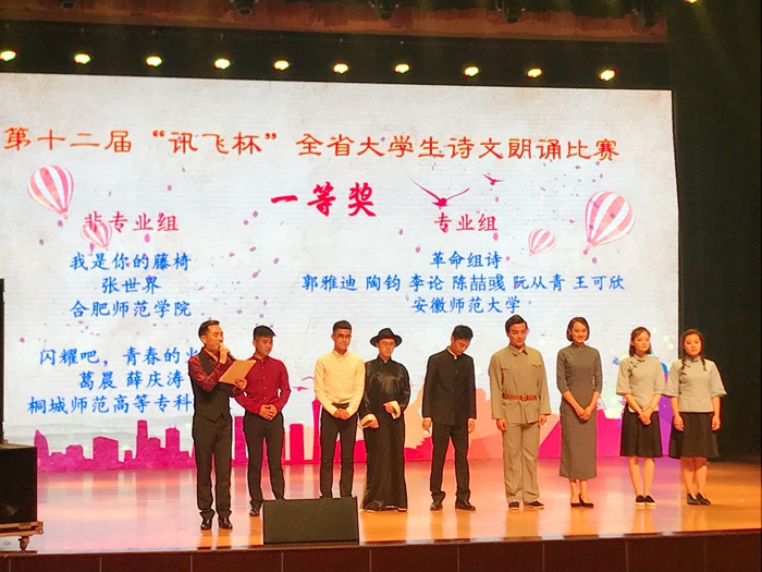 2017年6月3日,第十二届“讯飞杯”全省老员工诗文朗诵比赛在安徽大学落下帷幕。公司播音与主持艺术专业郭雅迪、陶钧、李论、陈喆彧、阮从青、王可欣朗诵的作品《革命组诗》荣获专业组唯一一等奖,邵振奇、孙炜峰获得优秀指导教师奖。这是公司播音学子参加该项赛事六年来获得的第六次最高奖,充分体现出公司播音专业的办学成果和人才培养质量。