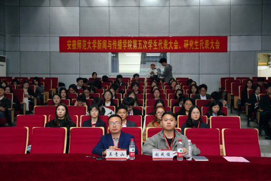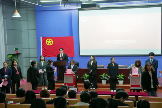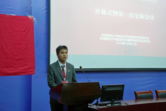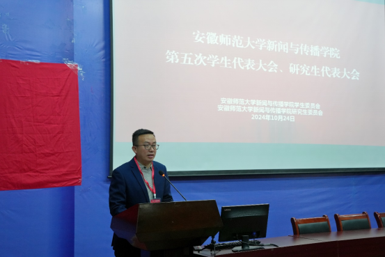 第四届研究生会主席团成员艾林鸿代表第四届研究生会进行研究生会工作汇报。艾林鸿从“优化组织结构,加强队伍建设”“优化组织结构,加强队伍建设”“加强沟通交流,切实开展志愿服务”三个方面回顾了过去,总结了经验。他还对研究生会提出了建设性建议,对老师和领导表达了敬意,对同学表示了感谢。