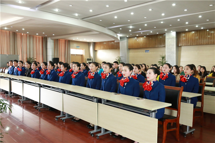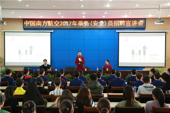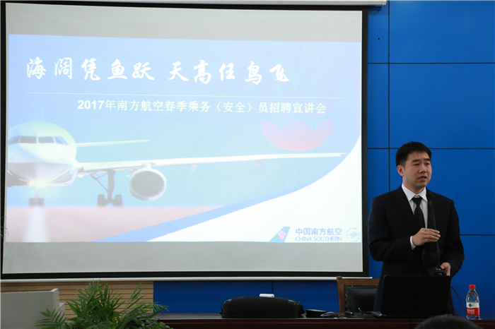 4月12日下午,中国南方航空于圆形报告厅二楼举办了2017年乘务(安全)员招聘宣讲会。中国南方航空湖北分公司部门招聘主管任靖、乘务员李全心、姜欣雨出席会议。公司党委副书记宋静、团委副书记马星宇、空乘专业教师及辅导员和2014级、2015级空乘专业学子一起聆听了此次招聘宣讲会。