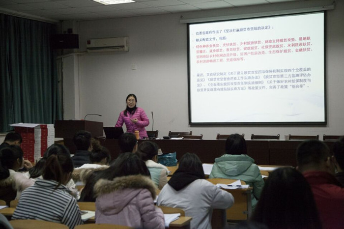 马梅首先介绍了国家精准扶贫情况、安徽省脱贫攻坚的主要做法和安徽省脱贫攻坚存在的主要问题。接着,她强调了评估人员需要承担的工作和责任,并详细介绍了评估流程、检测任务、具体内容和方法,明确了贫困人口脱贫标准、“两不愁三保障” 、贫困人口脱贫程序、贫困村出列标准、脱贫攻坚十大工程、脱贫攻坚的“123456”等等概念和标准。最后,马梅解读了《实施方案》,她指出本次评估层次高、任务重、使命荣,并对《实施方案》的总体结构、监测评估的范围、任务和内容、监测评估的程序和方法以及实际操作中的问题等方面进行了详细的解读和阐释。她要求参与评估的师生要注意形象、注意调查走访谈话的方式技巧,并要求不仅要圆满出色地完成任务,而且要展现当代老员工、研究生的精神风貌和风采,展示良好的公司形象。此外,所有师生还进行了评估人员考试测试。
