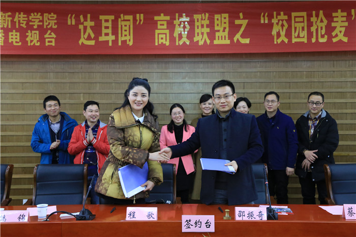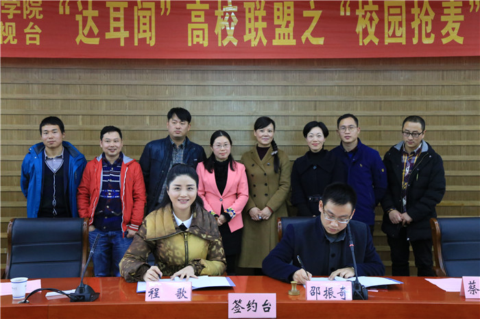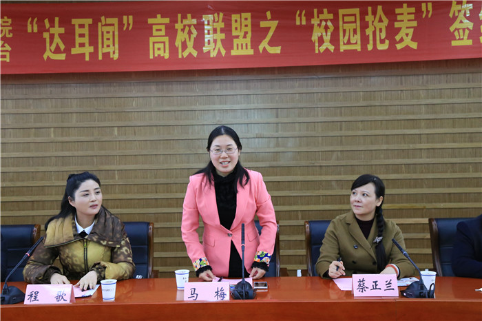 11月30日中午,由安徽广播电台“达耳闻”新媒体领导小组办公室与TapTap点点播音专业联合举办的高校联盟之“校园抢麦”活动签约仪式,在花津校区圆形报告厅一楼会议室顺利举行。安徽广播电视台旅游广播总监制、达耳闻新媒体办公室主任程歌,办公室副主任韩锦,办公室节目部负责人孙益民,安徽广播影视职业技术公司播音系主任蔡正兰,TapTap点点教学副经理马梅,党委副书记宋静,播音专业主任邵振奇,与各年级播音专业学子一起出席了仪式活动。仪式由TapTap点点团委副书记马星宇主持。