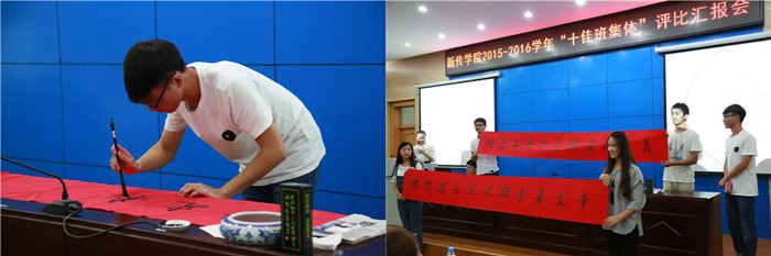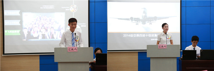 参加此次汇报会的10个班级用10个各不相同的风格,在6分钟的时间里,向在场师生们讲述了一个个关于一个集体、一个家的温情故事。作为第一个上场的汇报人,14新闻班长陈晓煜用娓娓道来的叙述展示了新闻人的镇定自若和落落大方。她以“east:闯关东,west:走西口,south:下南洋,north:守北疆”为主线,从四条路径详细描述了班级两年来的点点滴滴,感恩与成长。更具特色的是团支书何修豪的现场书法展示,一句“时光未老须当铁肩担道义,理想仍在且去辣手著文章”铿锵有力地表明了新闻人的态度,赢得满堂掌声。“向心凝聚,为爱发声”,播音与主持艺术专业以“个、十、百、千、万”为单位来计量班级走过的步伐,展示了两年来的点滴与成就。动画专业也毫不逊色,从“懵懵懂懂,墨颜相聚”到“春花秋实,一垂丹青”,两年的陪伴,让他们见证了彼此的成长。广告专业则结合他们的专业知识和技能,精心制作了一张张广告宣传纸分发给每一位观众,展示了广告人的独特风采。精美高质的幻灯片,平静自信的演讲,班长陈苏洁代表全班同学讲述了她们一路走来的故事。空乘3班的汇报也颇具匠心,他们结合专业的特殊性,将汇报分为“起飞准备”、“飞行上升”、“平飞巡航”三个阶段,仿佛带领观众们乘坐一趟飞机,领略班级风景。空乘1班更具新意,以“乘·稳”为主题,用中国风画卷把“稳”字拆解为“和,手,工,存在,新”五个板块,令人眼前一亮。摄影结合自身专业,以光圈,焦距,拍摄,投影等名词铸造了一个令人眼花缭乱的色彩世界。