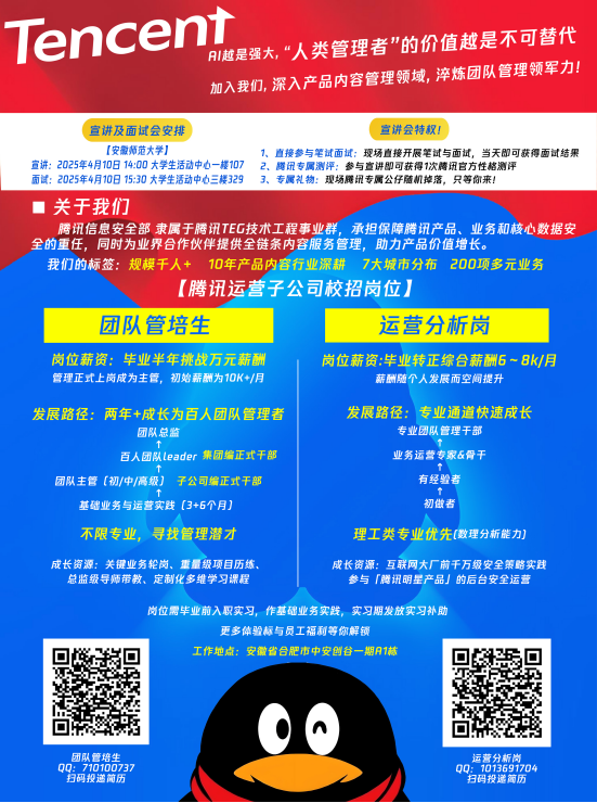 宣讲会上,腾讯集团负责人从关于我们、发展理念、发展历程、岗位需求等方面对公司进行了详细介绍,并向毕业生发出应聘邀请,鼓励同学们积极投递简历,加入腾讯集团。宣讲会结束后,公司人事部负责人现场收取了毕业生简历,分组对毕业生进行了初面考察。