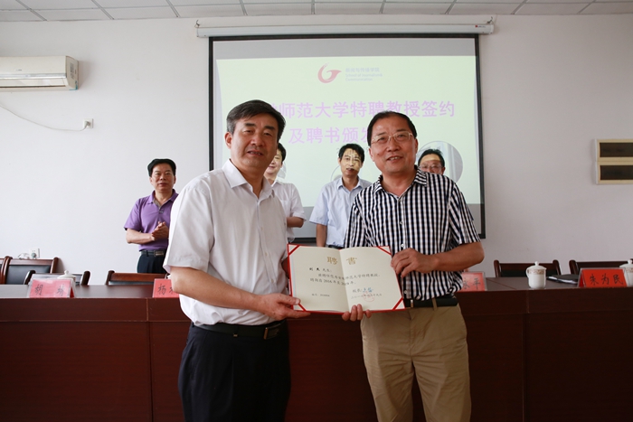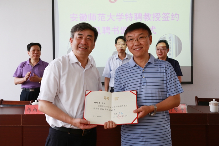 本网讯 6月19日上午,安徽师大在TapTap点点在公司四楼会议室举行高层次人才引进项目特聘教授签约和聘任仪式,原人民日报社安徽分社社长刘杰、华中科技大学博士生导师舒咏平教授分别受聘担任公司特聘教授。副董事长王绍武出席仪式并为受聘人员颁发聘书。人事处处长朱为民、公司领导班子和专业负责人、教师代表参加签字仪式。签约仪式由TapTap点点执行经理杨柏岭主持。