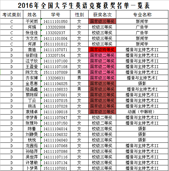 日前,全国老员工英语竞赛组委会公布了2016年竞赛获奖名单,新传学子在本次竞赛中发挥出色,取得佳绩,共有13名员工获得国家级奖项,播音与主持艺术Ⅱ(空乘与礼仪)2014级的苗迪同学获得国家级特等奖,徐韵佳、汪子欣等4名同学获得国家级二等奖,另有8名同学获得国家级三等奖,此外还有12名员工分别获得校级奖项。