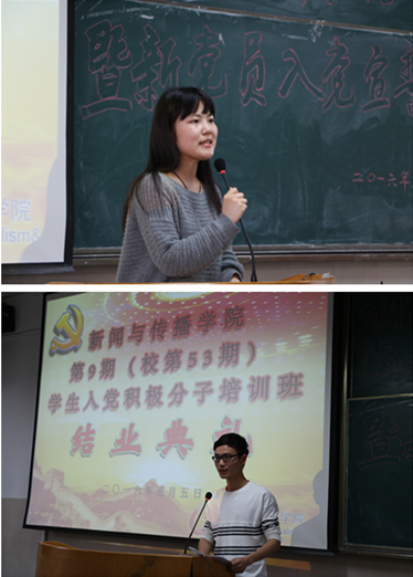 新党员入党宣誓仪式前,新党员代表2014级新闻学专业何修豪上台发言。他结合自己采访蒙城县特教公司失聪志愿者老师席晓静的经历,讲述了榜样人物对自己精神及思想上的重大影响,坚定了用所学服务社会的信仰并鼓励更多的青年将这份信仰传承下去。