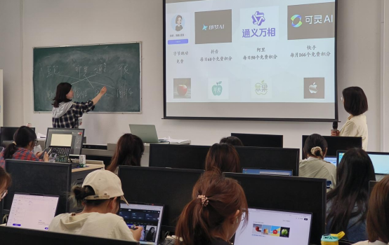 在随后的教学环节,吴静老师精心设计了对比实验教学模块:通过统一命题,即“生成一个苹果的logo”,要求员工在国内四个使用率较高的AI平台上进行创作实践。基于生成结果的视觉特征分析,吴老师组织同学们开展平台特性匹配测试,进而系统阐释各平台在算法逻辑、风格输出及技术局限等方面的差异化表现。在此基础上导入本节课的核心教学内容——Recraft AI工具的创新型应用。