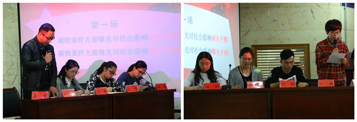 本次辩论赛共分为上下两场。各支队伍打破年级、专业限制,每队由研究生学员带队,共计16名素质高、能力强的选手组成正反双方,展开观点碰撞和思想交流。围绕辩题“腐败案件大量曝光对社会利大还是弊大”,随着正方一辩的开篇立论陈词,上半场辩论率先拉开大幕。来自研究生15级新闻与传播学专业的孙文结合党的十八大以来我党对于党风廉政建设和反腐败斗争的新要求出发,认为腐败案件大量曝光对筑牢公务人员思想防线,加强公务人员“三观”改造,营造良好的廉政环境,保持公务人员廉洁奉公的工作作风有着极为重要地推动作用,成效显著,对社会更有利。反方则始终认为“腐败案件大量曝光对社会弊大于利”。13级空乘专业的曹浩然牢牢抓住辩题中的“大量”,表示腐败案件的适度曝光可以起到警示作用,但过度曝光会降低群众对于政府的信任。另一方面,从报道平衡的角度而言,腐败案件的大量揭露在一定程度上弱化了“清廉为民”的政府形象。最为关键的是反腐的根本不在于大量曝光,而在于对公权力的有效制约和监督。