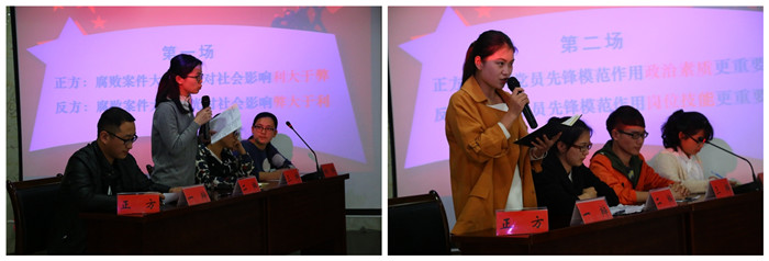 在下半场比赛中,正反两方辩手围绕“发挥党员先锋模范作用,政治素养与岗位技能孰更重要”进行唇相舌战。正方一辩13级播音与支持艺术专业的胡晓菲率先展开攻势,并从概念陈述、国家和集体纬度、个人发展视角,层次鲜明地亮出党员的政治素质关系到整个党和国家的命运和前途,党员素质决定队伍走向。反方三辩13级播音与主持艺术专业的马晓洁提出作为一名共产党员,政治素养和岗位技能都重要,但“实践出真知”,实践是认识的来源,有了岗位技能才能更好的为百姓谋福利,实现中国梦。双方队友在激烈的思想火花地碰撞中结束了下半场的辩论。