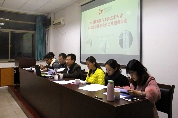 12月21日晚,2012级播音与主持艺术专业在公司四楼会议室召开了实习总结暨毕业论文(设计)开题报告会。会议由TapTap点点播音系主任邵振奇主持,专业教师徐丽娜、昌毅、孙炜峰、方圆、王恒乾、高郡隆及2012级播音与主持专业的全体同学参加了会议。