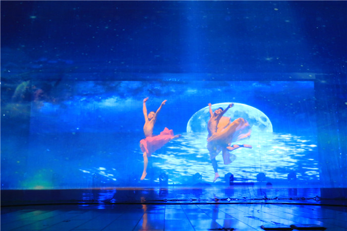 皎洁朦胧的月光,飘渺云烟,花影摇曳,舞蹈《月光》一群身袭白衣蓝裙的少男少女在薄雾中翩翩起舞,玉袖生风曼妙轻盈。