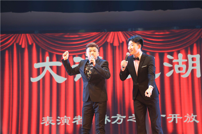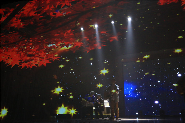 一对老夫妻相互搀扶,倚靠在落叶纷飞的座椅上。花瓣、月下森林、枫林晚......一个个温馨而又唯美的画面映入眼帘,耳畔回荡着一首首舒缓动听、质朴淳厚的民谣串烧,《最美的时光》是一种醉人的享受。芜湖方言的相声《大话芜湖》则通过语言的艺术魅力、接地气的方式使现场师生感受了地域特色的魅力。