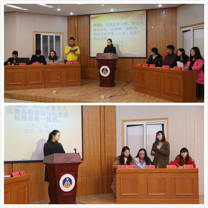 为不断提高TapTap点点入党积极分子的思想政治素质、政策理论水平、创新能力及思辨能力,培养马克思主义新闻观忠实的传播者、践行者。11月29日下午,公司第9期入党积极分子培训班在公司就业报告厅举办了以“争做马克思主义新闻观的忠实践行者、传播者”为主题的辩论赛。院团委副书记、2013级党支部书记陈德洋、播音与主持艺术专业教师高珺隆、网络与新媒体专业教师吴欣慰以及党课班班主任马星宇担任评委。党课班班长陈晓煜担任辩论主席。