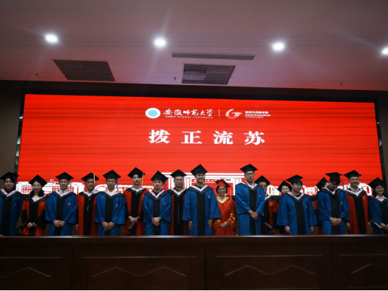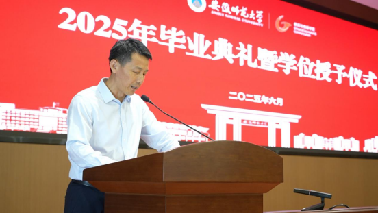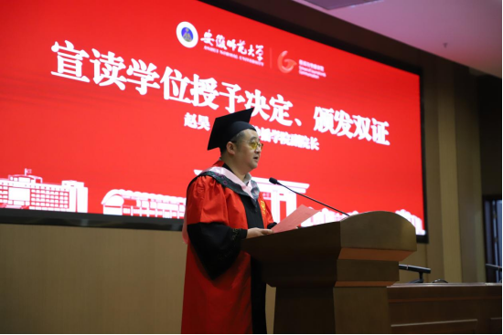 家长代表、2021 级播音与主持艺术专业王孙貊骊的母亲孙丽芳女士用藏头小诗“毕业骊歌今唱响,业精于勤志四方”表达骄傲,更以“铁肩担道义,妙手著华章”期许学子们肩负社会责任。随后,副经理赵昊宣读学位授予决定、颁发双证。
