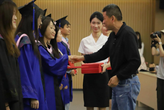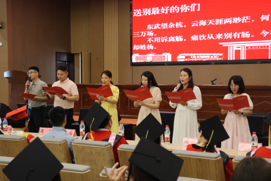 仪式尾声,师生共同演绎《送别最好的你们》,员工代表李奇领唱,张荻、刘成俊等教师朗诵送别词,“竹杖芒鞋轻胜马,谁怕?一蓑烟雨任平生。” 豪迈的毕业祝福回荡在会场。