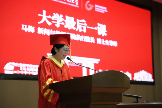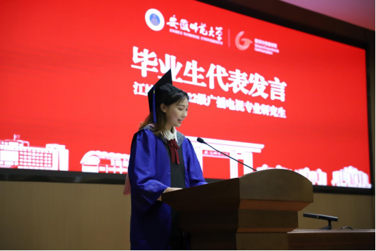 第一篇章“我们的青春回响”以专题纪念视频《我们的青春回响》开篇,回溯了毕业生们在图书馆挑灯夜读、在田野间专注实践、在校园活动中挥洒汗水的日常。2021级网络与新媒体专业的张思颖带来表演《新传说》,用歌声诠释了新传人对梦想的执着。接下来,毕业生代表、2022级广播电视专业研究生江婉琪在发言中动情回忆道:“忘不了花津湖的黑天鹅,忘不了小时代的红汤面,更忘不了‘厚德、重教、博学、笃行’的校训。”她代表全体毕业生向母校、师长和亲友致以谢意,并以“路漫漫其修远兮”共勉,呼吁同学们以奋斗之姿奔赴未来。