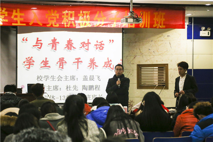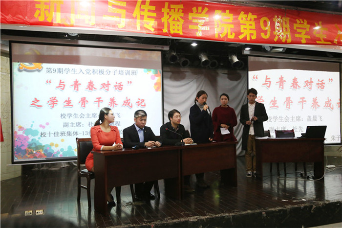 12月9日晚,公司第9期入党积极分子培训班在校团委多功能厅举办“与青春对话”活动,活动邀请校员工会主席盖晨飞,副主席杜先、陶鹏程,校十佳班级体——13级文管班班长朱子钰对话公司入党积极分子。党课班班主任马星宇与全体学员参加此次活动,一起倾听四位优秀员工干部“员工骨干养成记”以及大学感悟的分享。
