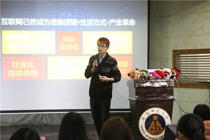 下午两点半招聘会准时开始。新浪安徽策略中心总监谢励鹏首先进行宣讲,为同学们简要介绍了新浪安徽的发展现状与总体规划。紧接着,就职于新浪安徽的06级广告学吴晴晴为同学们分享了她的就业经验。她从完成就业的三个环节“择业”、“蛰伏”、“爆发+更长的蛰伏”讲起,与应聘者分享了一条“3年基础+4年基础管理+3年高管”的就业路径,勉励同学们找准目标,实现就业。随后,该企业人事行政经理缪瑞红从公司内部结构、员工发展、薪酬标准等方面更为细致具体的描绘了公司全景,并与应聘同学进行亲切互动,通过有奖问答的方式为同学们送出了精美的小礼物。