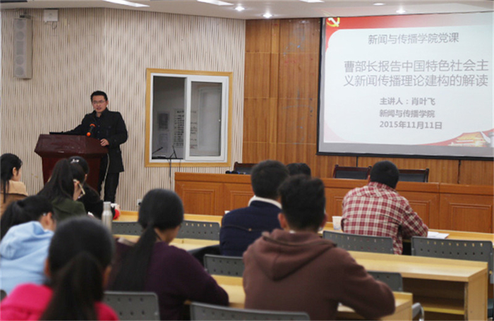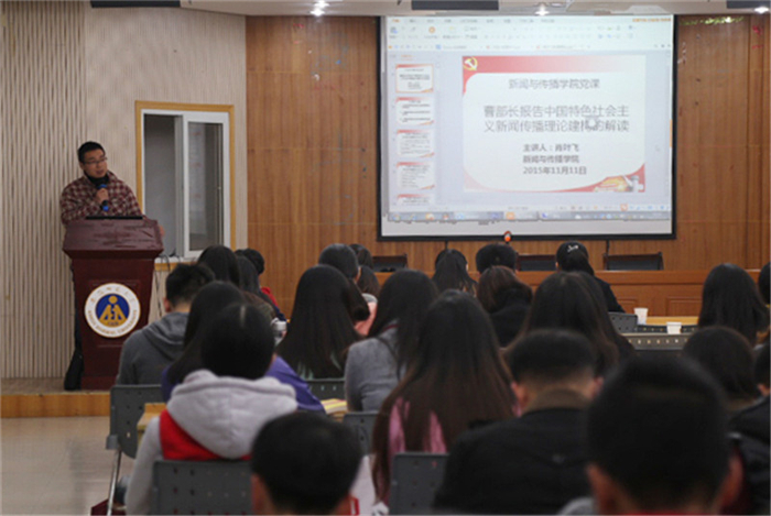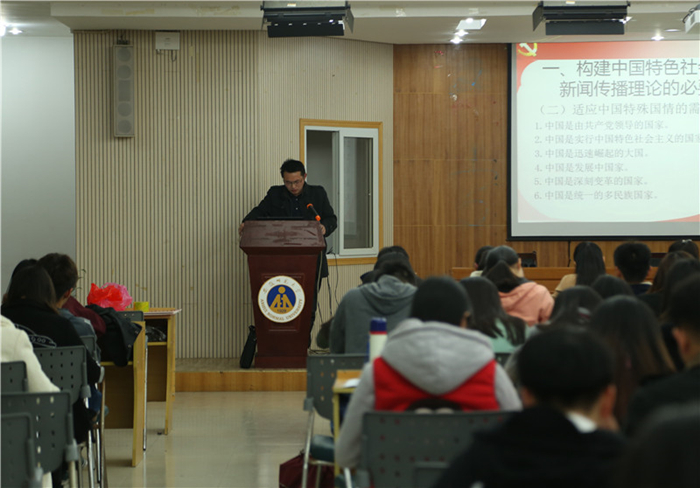 肖叶飞首先结合自身经历,讲述了曹部长报告历经多次修改到最后定稿的整个过程,并对部校共建新闻公司的背景做了简单回顾。随后,他从必要性、主要来源、框架内容三个方面对建构中国特色社会主义新闻传播理论进行了宏观介绍和详细解读。对比西方新闻传播理论和实践,肖叶飞表示要结合中国的特殊国情,推进中国特色社会主义新闻理论的建设。结合当前互联网时代的特点,他反复强调中国是共产党领导的国家,需坚持党性与群众性的和谐统一。反思新闻媒体的不当行为,他指出提高记者理论和道德素养的重要性。援引古今,肖叶飞带领学员们了解了马克思主义新闻观在不同时期的发展情况,并指出其对建构中国特色社会主义新闻传播理论的补充和借鉴意义。紧接着,结合拉斯韦尔的5W理论,肖博士着重分析了中国特色社会主义理论的框架内容。就新闻传播是什么的问题,他使用了阵地、桥梁和舆论载体三个名词对党、政府和人民三个方面做了阐释,揭示了新闻传播的服务性。结合欧洲媒体和美国媒体的一些具体案例,就新闻自由这一理论,肖博士表达了自己的观点:“任何国家的新闻自由都不是绝对的自由,而是有约束,受控制的。”他更特别讲述了自由与控制、民主与法治这两对概念的统一性。针对新闻传播的效果和影响,肖博士从满足人民需求和在世界发声两大方面加以阐明。“希望同学们早日加入党组织”,最后,肖叶飞博士用一句寄语结束了这次授课。