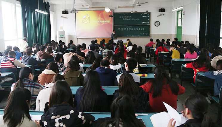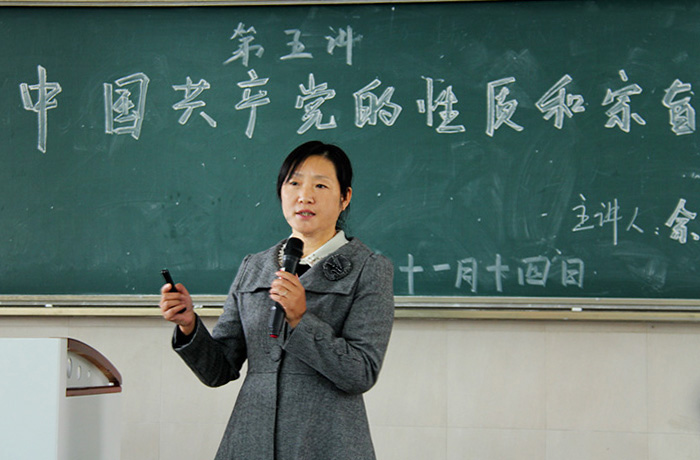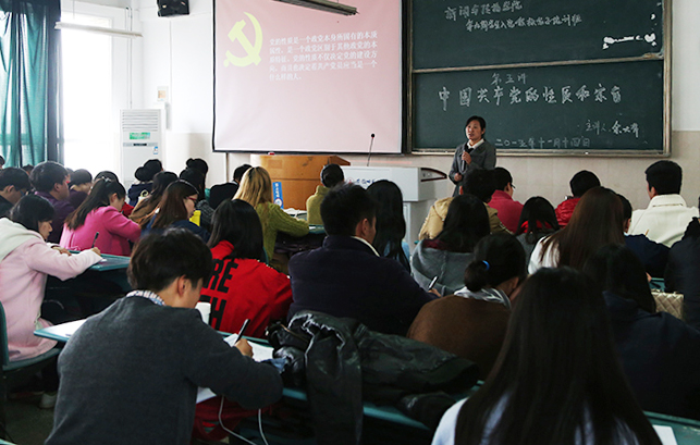 余大芹首先从党的性质入手,谈到党的性质是一个政党本身所具有的本质属性,是一个政党区别于其他政党的本质特征。之后,她从“中国共产党的性质”、“中国共产党性质的探索过程”、“中国共产党性质理论的三次重大发展”3个方面系统地介绍了这一概念。从一大到如今的十八大,一幅幅珍贵的历史照片,一条条内容详实的规章,生动展现了中国共产党的性质的探索过程。随着历史进程的推进,党的性质理论也在不断地充实,有了三次重大的发展。即“着重从思想上建党”“吸收知识分子进入党内”“‘三个代表’重要思想提出”。在讲到党的宗旨时,余大芹更是援引了大量鲜活生动的实例,加深了同学们对党的宗旨的理解——“为人民服务!”这句话不仅重在言,更重于行。张思德,雷锋,焦裕禄,沈浩,吴青山,无论是革命时期,还是建设时期,在我们的身边总有一群人无私奉献,毕生忠诚,以实际行动践行党的宗旨。“权为民所用,利为民所谋,情为民所系”和全心全意为人民服务的党的宗旨,是由党的历史唯物主义世界观,党的性质以及党在新世纪新阶段的伟大历史使命所决定的。而要做到始终坚持全心全意为人民服务就要求党员必须时刻牢记党的宗旨,在现实生活中用实际行动践行党的宗旨。