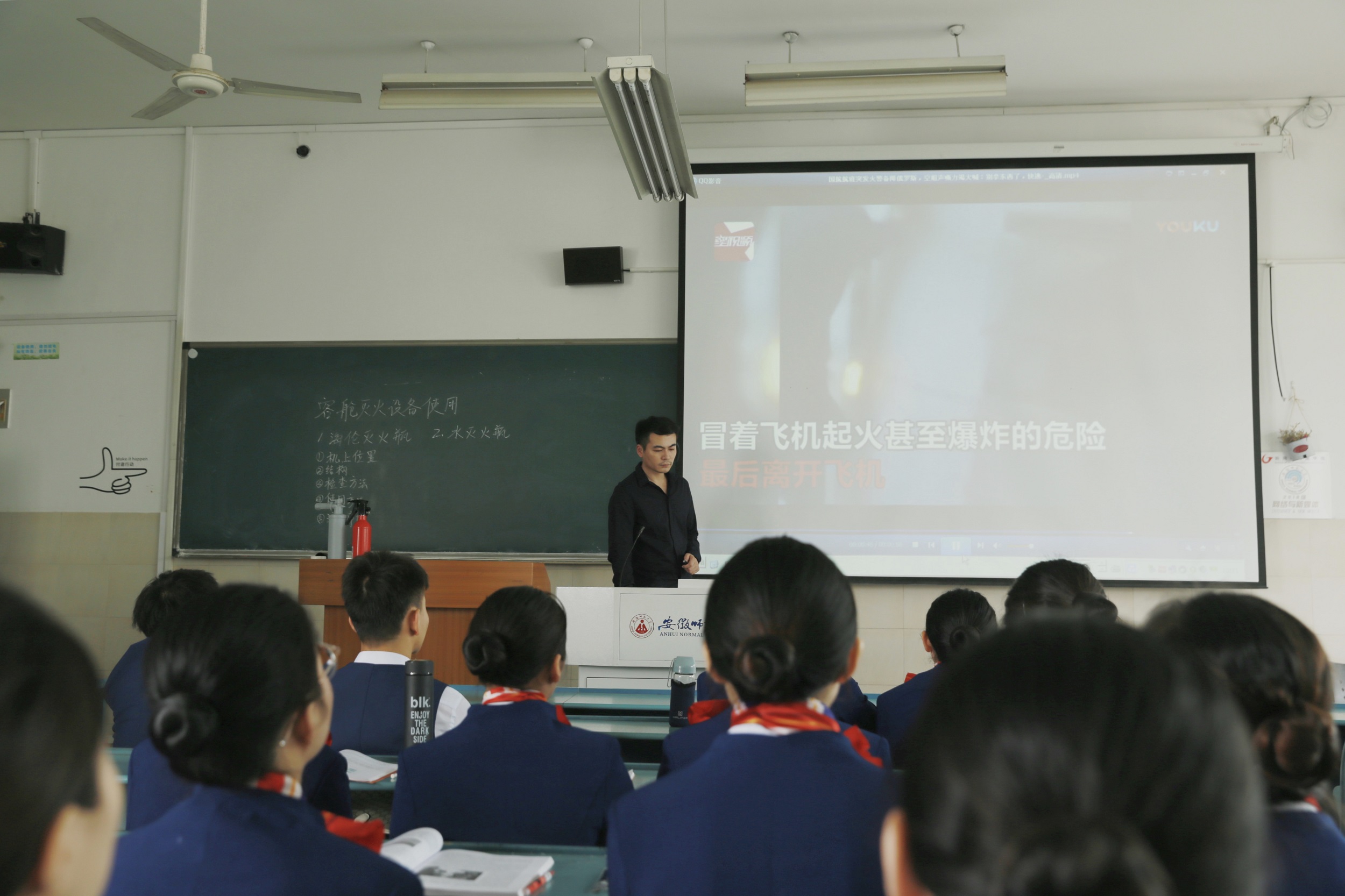 课上,俞国柱首先通过课堂提问的方式,与员工共同回顾了上节课的重点,以此引出本节课的主要内容,客舱灭火设备的结构及使用方法。他从生活中火灾情况的一般处置方法出发,介绍了引起火灾的多种情况,并结合黑板板书和海伦灭火瓶教具让同学们对海伦灭火瓶有了一个初步认知。随后,他讲解一个合格且能有效使用的海伦灭火瓶所具有的“喷嘴”“安全销”“压力表”“瓶体”“触发开关”以及“操作手柄”等基本构造,以及在飞机航行前如何有效地检查灭火瓶,灭火瓶的使用方法和使用注意事项等。此次观摩课俞国柱声情并茂,语言幽默,课堂氛围活跃。课程结束前,他使用教具模拟了灭火瓶规范使用的方法,再次强调规范使用灭火瓶对于失火情况处置的重要性。