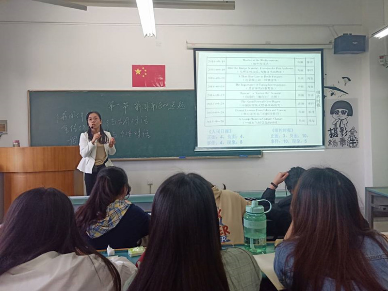 课上,两位同学进行课堂汇报展示,结合当前的热点事件用专业理论进行评述。在她们展示后,王友群老师针对她们的表现一一作了点评,在肯定优点的同时也指出了些许不足,让同学都更直观地体会到如何充分地进行新闻评论。随后,王友群老师正式开始了课堂教学。这节课的重点是关于如何确立新闻评论的选题和立意,并根据现实需求分析出影响评论选题的直接因素。王老师提出“有哪些可行的选题方法”这一思考问题后,同学们进行了热烈的讨论,最终得出结论。在这节课上,同学们积极热情,认真做笔记,对王老师的提问积极响应,主动举手回答老师的问题,课程气氛十分活跃。