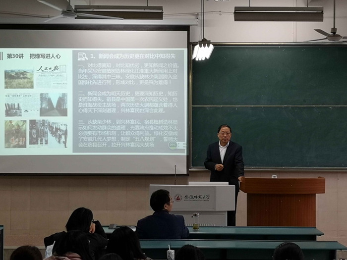 3月27日下午2时30分,人民日报安徽分社原社长刘杰记者在2050302教室给2018级新闻传播类1班、2班的员工带来了“刘杰故事汇”第五季,新闻学专业主任肖叶飞教授主持。本次故事会的内容为第三十讲《把绿写进人心》及第三十一讲《解“渴”》。