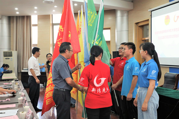 仪式最后,与会领导为校、院级重点团队分批次一一授旗。