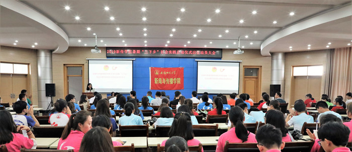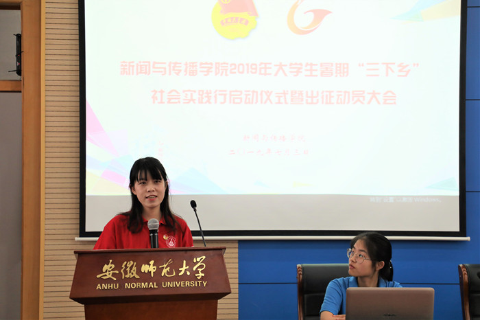团歌悠扬,启动仪式在全体与会成员的合唱声中拉开了帷幕。与会师生共同观看了由院社会实践员工工作组精心制作的短片《2019新传先锋再出发》。短片中回顾了2018年新传学子暑期社会实践团队的精彩表现,送达了公司领导老师与优秀志愿者代表给2019年社会实践团队的期冀与祝福。