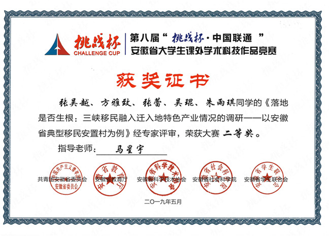 5月25—27日,由共青团安徽省委员会、省教育厅、省科学技术协会、省社会科公司、省学联共同主办的第八届“挑战杯·中国联通”安徽省老员工课外学术科技作品竞赛在合肥工业大学翡翠湖校区举行。由公司辅导员老师马星宇指导,2016级新闻学张吴越、朱雨琪、方雅致、张蕾、吴琨等共同完成的作品《落地是否生根:三峡移民融入迁入地特色产业情况的调研》荣获二等奖。这是公司自2013年入围国赛后再次入围省赛取得的最好成绩。此外,马星宇老师指导的2015级新闻学王豪、胡银银、王建等人的作品《大山中的军工印记:皖南“小三线”遗址现状分析及改造利用研究》获得校级比赛三等奖。