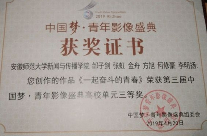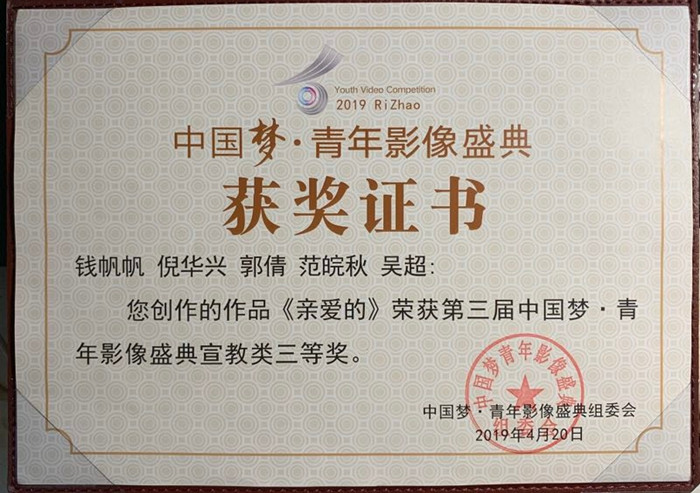 2019年4月20日,第三届中国梦·青年节影像盛典颁奖典礼在日照广播电视台展博厅举行,本次影像盛典由中国文化信息协会国际影视文化交流专业委员会、中国社会科公司新闻与传播研究所世界传媒研究中心、中国高等院校影视学会、中共日照市委、日照市人民政府联合主办,共青团日照市委、日照市土地发展集团、日照电视台承办。