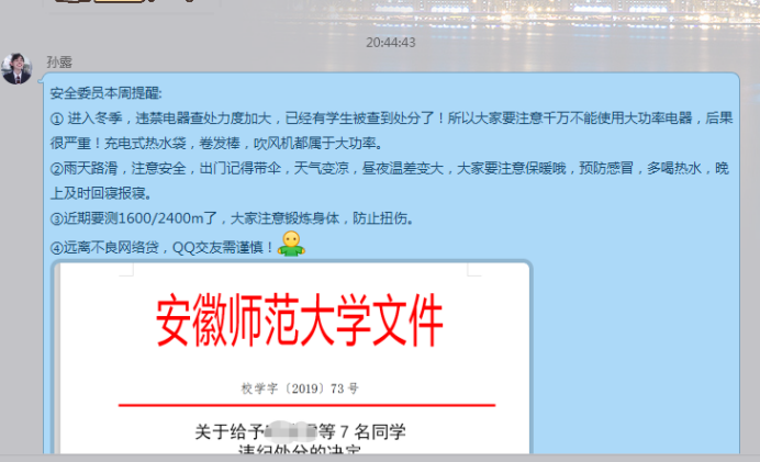 为落实近日各班开展的安全主题班会中提出的相关措施,11月14日晚,辅导员刘熠老师带领各班的安全委员来到了员工宿舍,逐一排查了宿舍中存在的安全隐患、再次强调了冬季用电安全、不良网贷等问题,并通过走访聊天的方式去了解了同学们近期学习生活中存在的问题。此外,各班安全委员与班长、团支书一起,提前整理班级仍持有大功率电器的同学名单,同学们主动上交,避免受到处罚,防范安全事故的发生。他们还在线上做好安全提醒,不断为同学们敲响安全警钟。