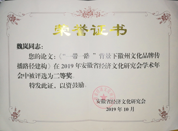 公司教师魏岚、杨帆参加了会议。魏岚提交的论文《“一带一路”背景下徽州文化品牌传播路径建构》获得优秀论文二等奖,并颁发了证书。