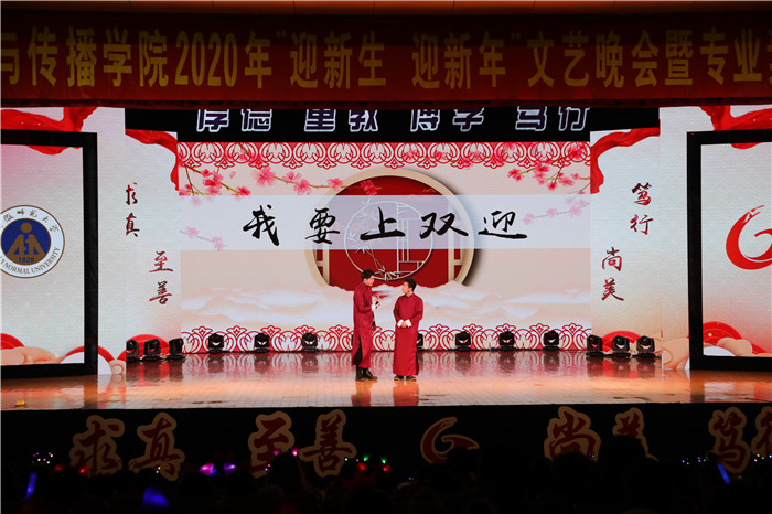 “台上一分钟,台下十年功”,相声节目《我要上双迎》以独特的视角揭秘双迎选拔背后的故事。它从“双迎”晚会的筹备前后讲起,在身边细微的琐事中发掘笑料,于校园生活中寻找乐趣,从影视经典中创作精品,有意思,接地气,引得台下欢笑阵阵,掌声不断,晚会气氛十分活跃。青春是对自由的向往,青春是对缤纷的幻想。歌曲串烧《青春绽芳华》用一个个音符组成了青春的旋律,用一首首歌串联起年少的激情与活力。《演员》以平白的文字述说深情伤感,决定坦荡放手;原创歌曲《花津南路2号》将那条路上的故事缓缓道来;面对重重困难,要相信自己,坚定脚步,学会《淋雨一直走》,有梦想就别轻易忘记;《光年之外》以缠绵的歌词搭配动人的旋律,将极致浪漫的深空爱恋演绎得气势磅礴;而《失恋阵线联盟》又将听众带回上个世纪,感受他们的爱情冷暖。跳动的旋律点燃青春的激情,飞扬的音乐诠释着美好的希望。街舞表演《Wecanreallydance》动感的舞姿活力四射,引燃全场,用街舞的时尚与动感完美呈现了风华正茂的新传学子的青春活力。