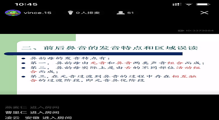 课程开始,高郡隆老师使用两则生活趣闻引出了本章内容:普通话前后鼻音的辨正。本章节共分为四个小节分别是普通话鼻音韵母的定义和分类、前后鼻音的发音特点和区域误读、前后鼻音的发音原理和位置以及前后鼻音识读技巧。高老师用动图和视频的方式生动形象地展示了不同读音的正确发音方式;在讲授理论知识之后,又根据每个同学所在的省份,来分区域的解读不同的地方语言习惯所造成的不同误读。例如:皖北片区靠近河南、山东、山西省份的同学,受中原官话的影响;以及皖南地区靠近江西、湖南的同学,可能受到湘、赣方言的影响,使前后鼻音发音或辨正出现偏误。