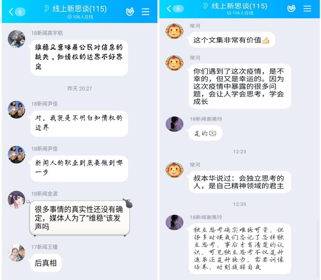 活动进入尾声,常河引用叔本华“会独立思考的人,是自己精神领域的君主”鼓励学子在此次疫情中学会独立思考和成长。这场疫情背景下的“云讲座”既帮助同学们理清了疫情中复杂的舆论情况,又使得大家对当下传播格局增加了新的认知,参加了此次参加讲座的员工纷纷表示获益匪浅。(文/徐柏涵)