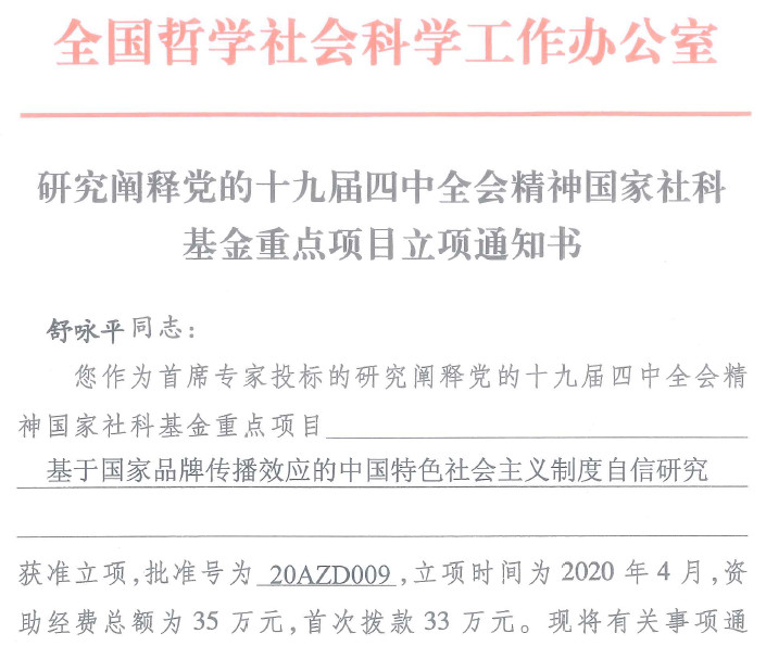 近日,接全国哲学社会科学工作办公室立项通知,公司柔性人才舒咏平教授申报的研究阐释党的十九届四中全会精神国家社科基金重大项目转为重点项目立项,立项后的项目名称为“基于国家品牌传播效应的中国特色社会主义制度自信研究”,项目批准号为20AZD009,资助经费为35万元,这是公司获批立项的首个国家社科基金重点项目。