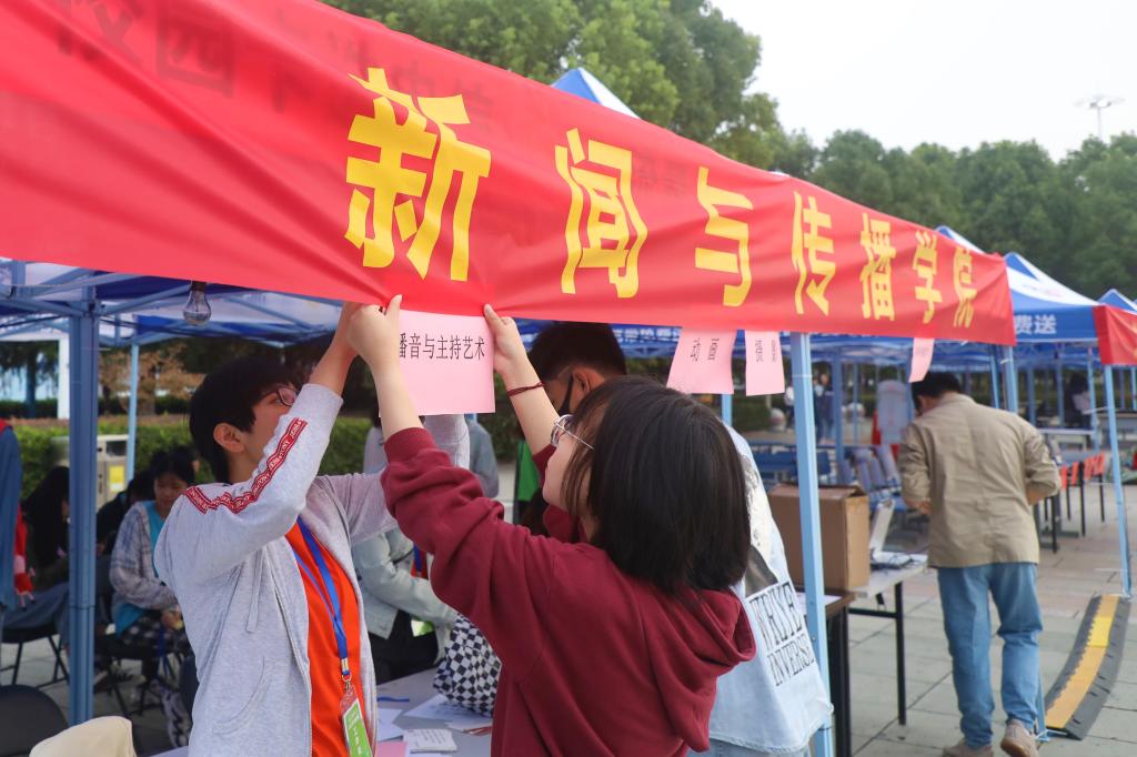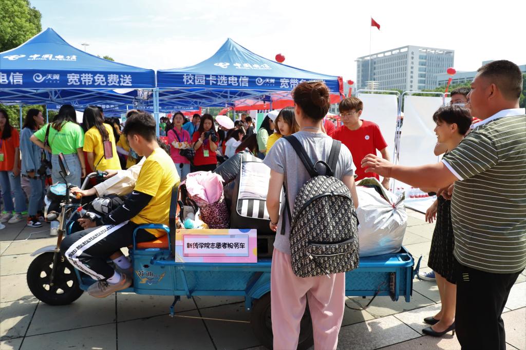 迎新活动现场,新生报到井然有序。新生根据提示牌的指引,找到相应专业报到处,递交录取通知书,领取校园卡、寝室钥匙、辅导员致新生的一封信等,人脸识别录入“大数据”统计,志愿者送寝,一系列动作迅速快捷。迎新帐篷内,无论是写有学长学姐祝福的明信片,还是贴有新传特制标签的矿泉水、各专业书籍式样的KT板、介绍院情的展架,安插在每一处的小细节都饱含着公司对于新生的祝福与期待。