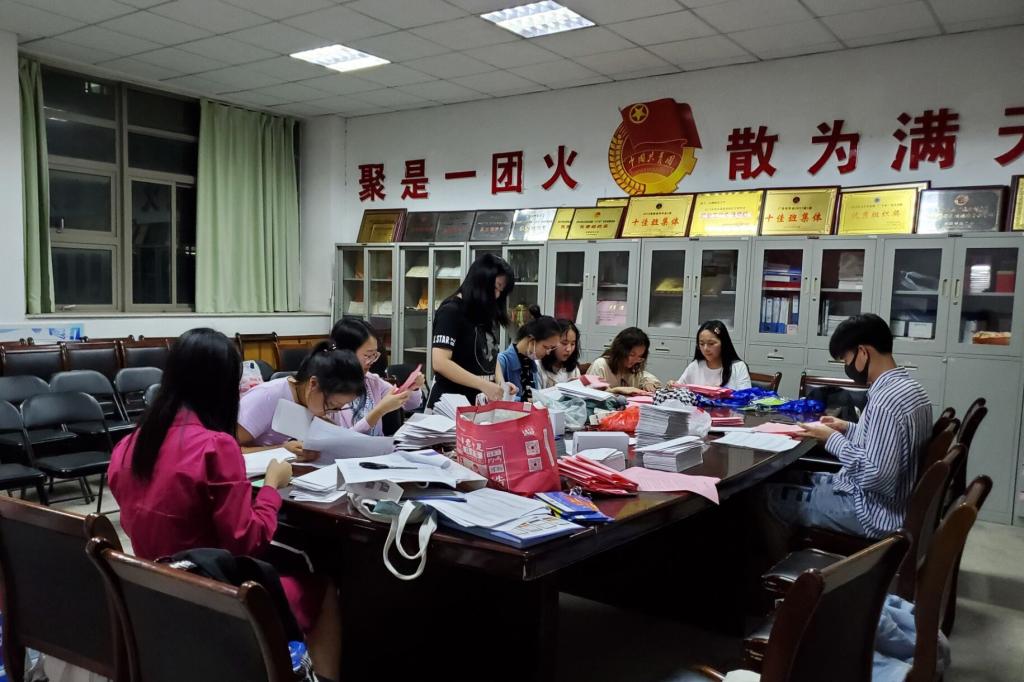 9月18日下午,横幅悬挂、寝室床贴布置、迎新大礼包摆放等前期等工作全部完成。迎新当日,员工工作人员提前到达新生报到处进行最后的提示牌、地贴等装饰布置,等待新生的到来。