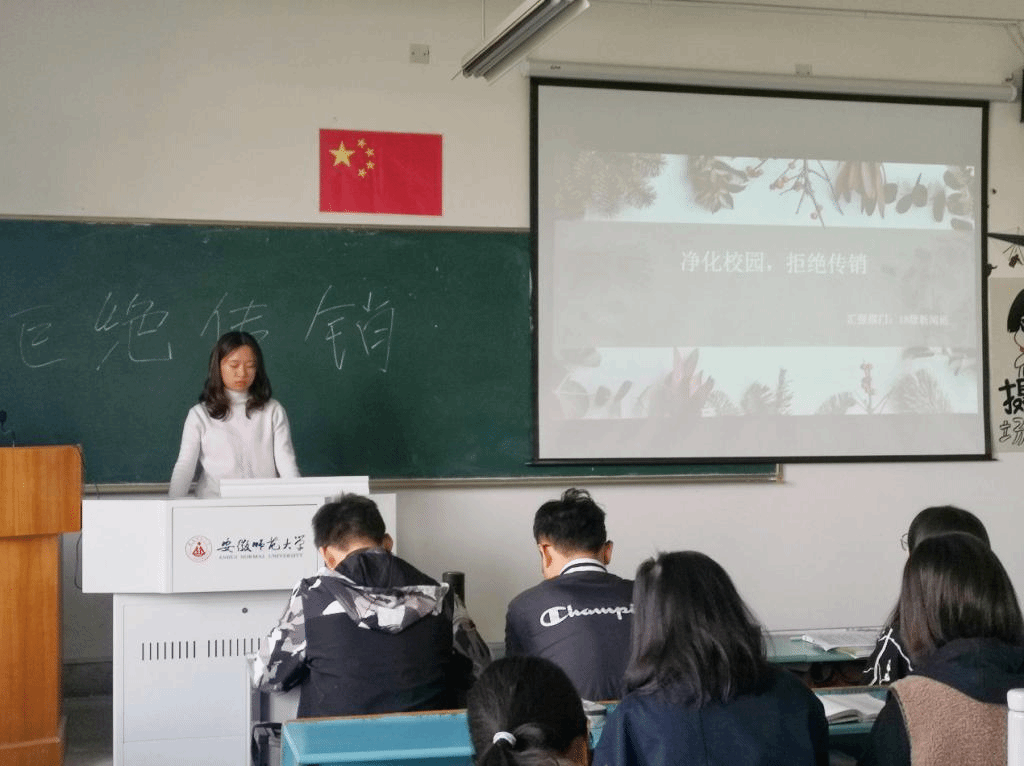 10月22日中午11点30分,2018级新闻班在2070307教室召开了“净化校园、拒绝传销”主题班会活动,本次班会由安全委员朱世敏主讲,2018级新闻班及中英新闻班全体同学参加本次会议。