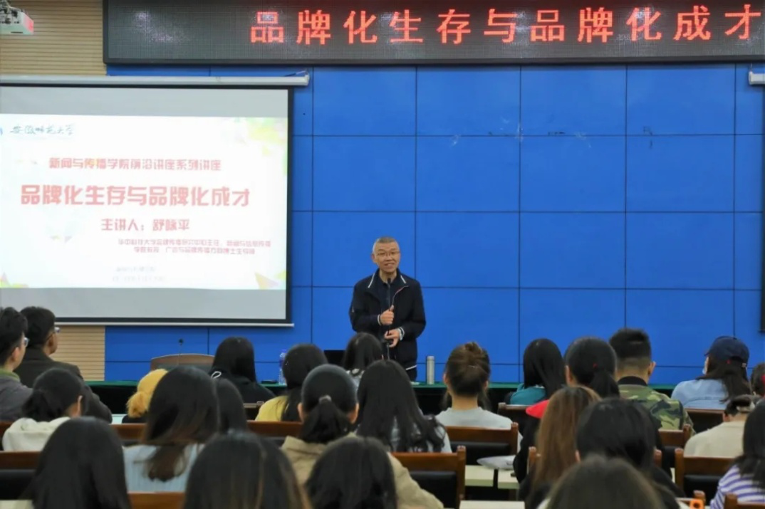 讲座活动中,舒咏平教授融贯古今,结合爱国主义、民族情感、国家形象与同学们分享了现实中的案例,向同学们传达了品牌传播正在崛起,品牌化成才刻不容缓的理念。引用大卫·申克关于信息的观点,舒咏平教授从理论上分析了品牌传播的重要性:不论是产品或服务,还是企业和国家,好的品牌内涵才能塑造好的品牌形象,中国正成为国际上“国家品牌发展”领导者;他认为新闻、广告归属于品牌传播,而品牌传播比新闻广告做的更多,由此提出“品牌智能传播”的观点,利用数字媒体技术进行品牌营销智能管理;此外,舒咏平教授着重为同学们介绍了个人品牌生存与发展,举例说明当代社会培养品牌传播人才方法与关键,并殷切表达对未来员工成才的期望。