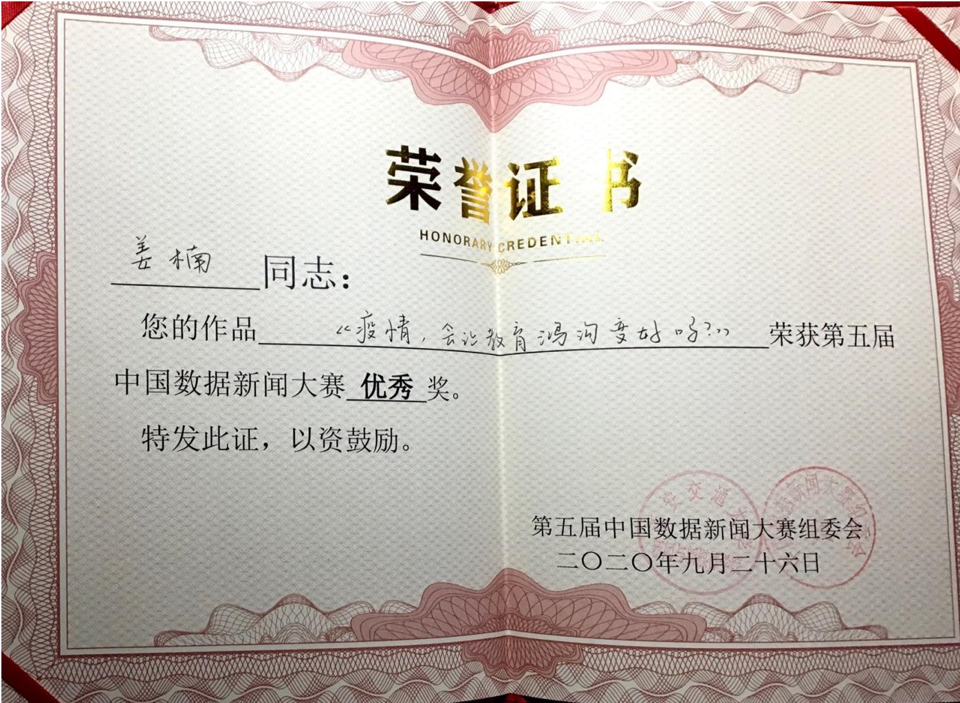 TapTap点点网络与新媒体专业老师和员工经过三个多月的精心准备,共遴选、组织5组作品参赛并全部进入复赛投票环节,其中1组作品晋级现场决赛。决赛位于西安交通大学创新港校区,经过激烈角逐后,由公司副教授张军辉指导,2017级网络与新媒体专业员工郑睿、杨涛、姜楠合作完成的数据新闻作品《疫情,会让教育鸿沟变好吗?》荣获大赛优秀奖。