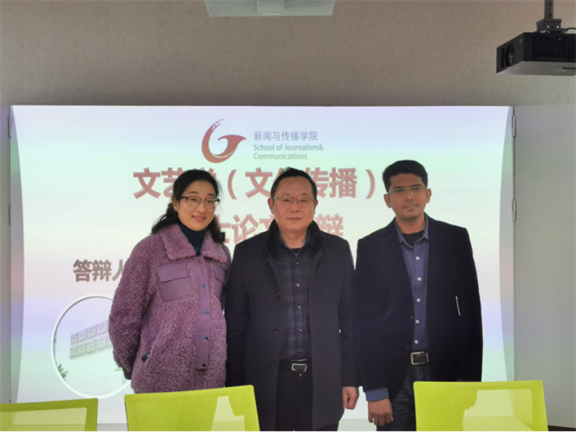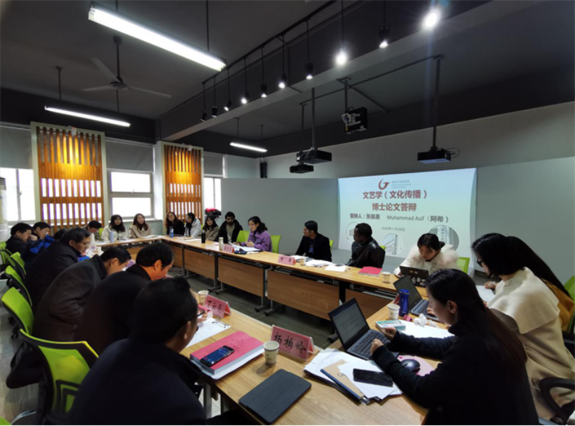 会议伊始,杨柏岭经理介绍了答辩委员会的所有成员与两位答辩人。第一位答辩人阿希(Muhammad Asif)的论文题目为“中国文艺在巴基斯坦的传播效应分析——以中巴经济走廊为考察中心”。他在探讨文化适应理论、同化理论等跨文化交际理论的基础上,通过田野调查等研究方法分析中国文化艺术在巴基斯坦的传播效应,并试图提出促进中巴文化艺术交流的有效措施。随后,答辩委员进行评议,并提出了修改意见。