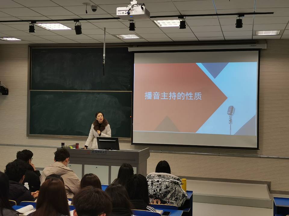 课程伊始,张荻老师首先展示了同学们课前思考题的答题情况,从同学们对于播音主持的不同认识入手引出课程的第一个概念——播音主持的多质性,对于其多质性所包含的新闻性、艺术性、语言性、技术性依次进行讲解并辅以生动案例。张荻老师还善于将课程思政元素融入教学内容里,引导员工增强民族自豪感和职业使命感。她从员工身边显而易见的“中国创造”“安徽创造”入手,使同学们对于“创造”的含义深入理解,运用现代汉语词典、心理学及书本内容解释播音主持的创造性。随后,课程回归到播音主持的主调——新闻性。播音主持在言语表达上可以体现出时效性、在情感表达上可以体现出真实性,这与新闻的时效性和真实性非常相似。张荻老师将“湖南卫视媒体战疫”及“综艺节目《蒙面唱将猜猜猜》造假丧失公信力”等案例进行对比,引起同学们对于职业责任的重视。她为同学们朗读了《播音主持委员会向奋战在疫情报道一线的播音员主持人致敬》稿件节选,在座的同学们纷纷为之感动。最后,张荻老师留下思考辩论及学科交融方面的两道课后作业供同学们思考学习。本次示范课摒弃了照本宣科、一字不落的说教的传统教学方法,整体课堂气氛活跃,师生互动愉悦而不乏专业性,这样的课是对老师教学功底与理论功底的最好体现。